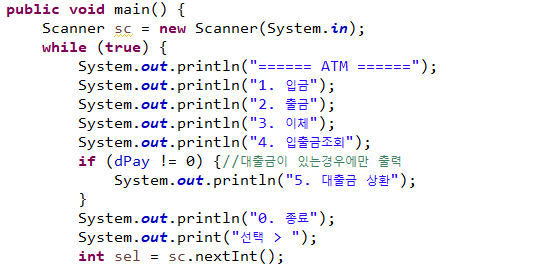 - ATM : 입금 / 출금 / 계좌이체 / 입출금조회 / 출금시 금액이 모자라는경우 대출받는 프로그램