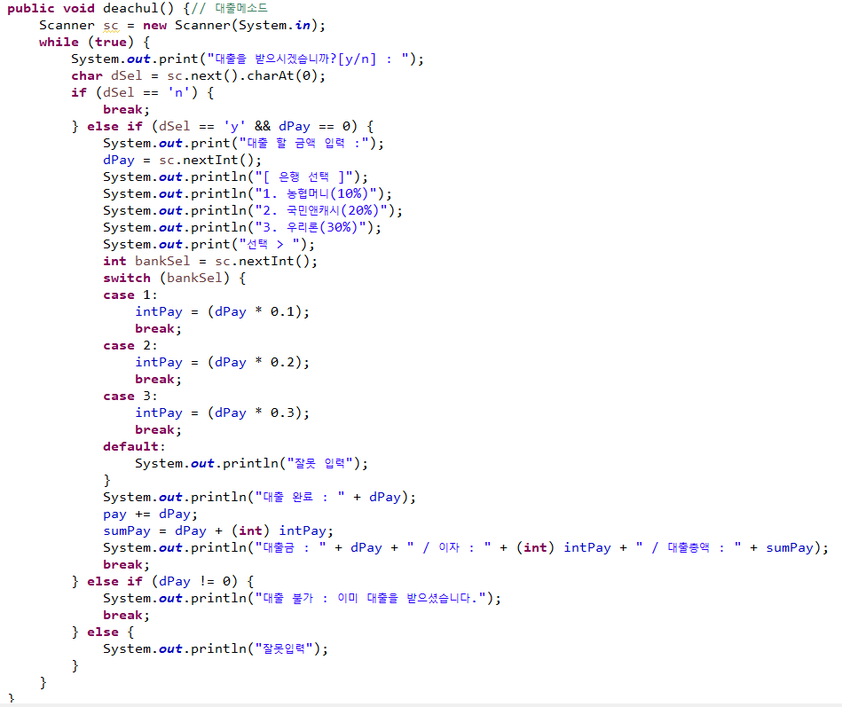 deachul() : 대출메소드, 출금시 잔액이모자라면 대출여부를 물어보고 이메소드를 호출하여 실행한다.