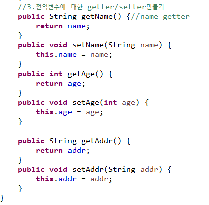 이렇게 getter/setter를 작성하면 private임에도 실행클래스에서도 사용가능(getter : 값가져오기 setter : 값세팅하기)