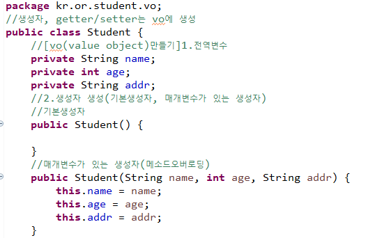 오늘은 객체에 대해배웠다. vo파일을 만들어서 getter/setter로 뽑아내 vo파일명타입에 담아 값을 대입하고 꺼내오고 하는게 처음에는 전혀모르겠어서 힘들었지만 몇번 코드를 작성해보니 거의 이해가됐다! 변수의 자료형을 기본자료형이나 존재하는 배열/참조형만 사용해봤더니 내가만든 VO타입으로 선언할수있을거라는 생각을 전혀못해서 그게 너무어려웠다ㅎ