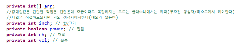 -private로 선언하여 해당 클래스외에는 사용할 수 없도록한다.(사용하고 싶을경우 getter / setter사용)