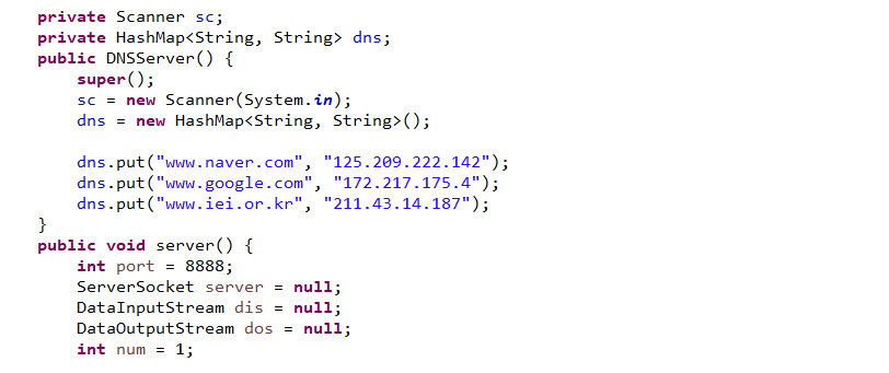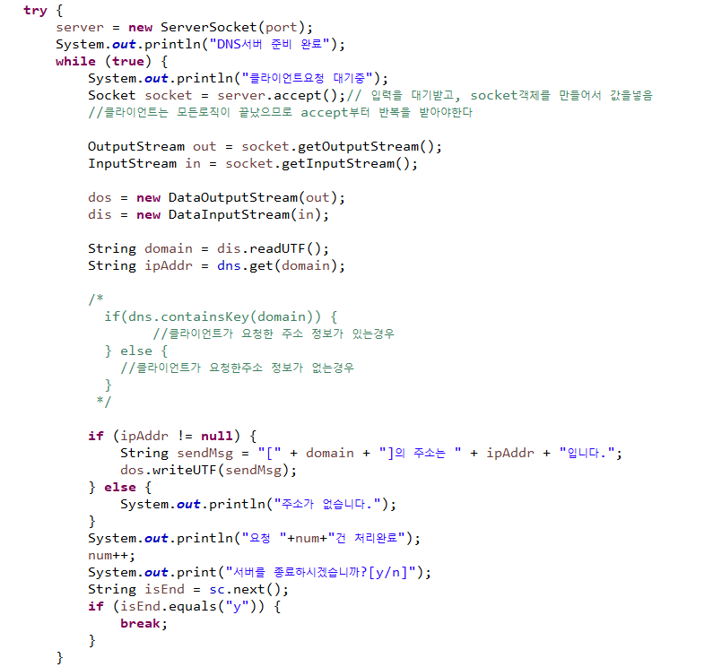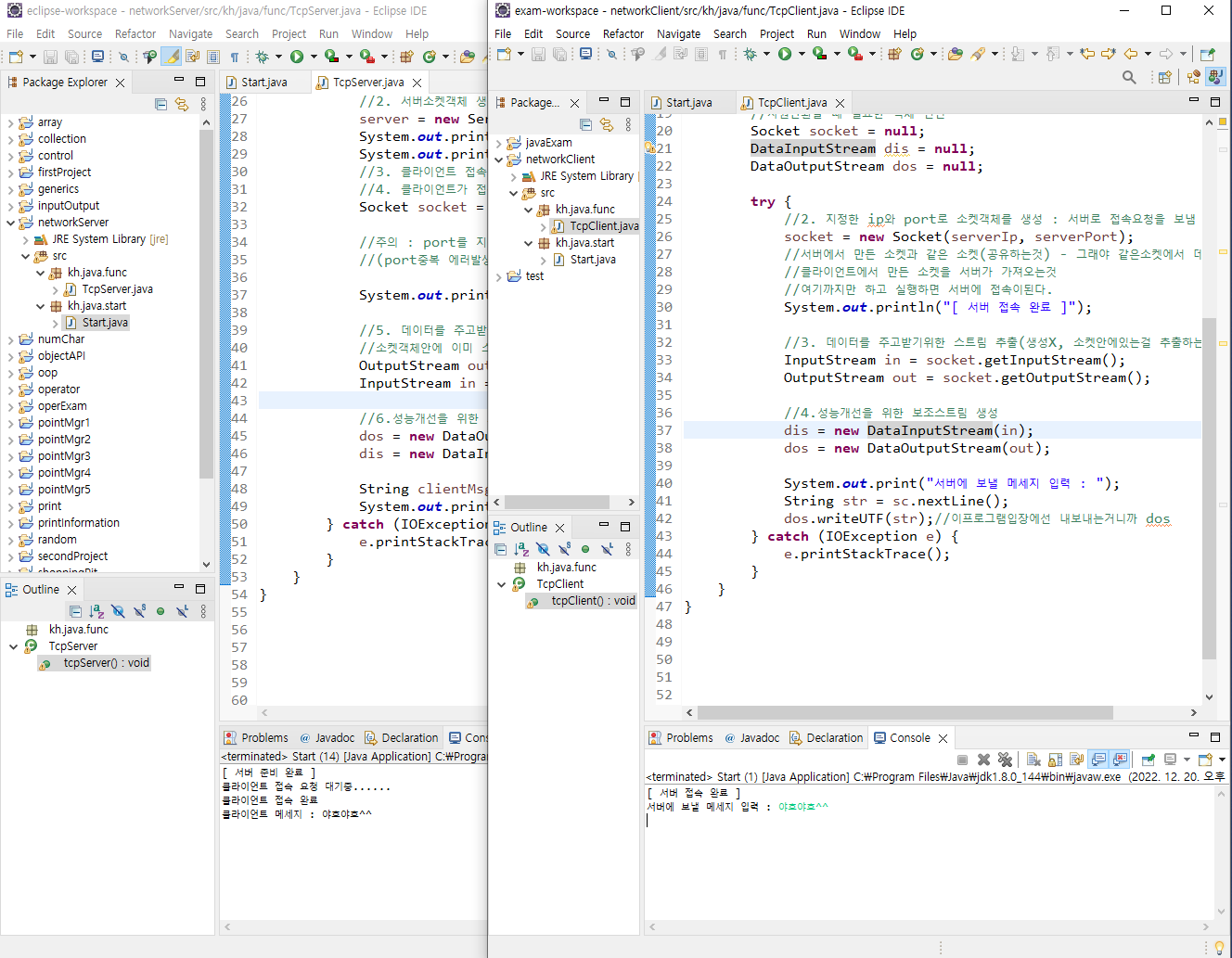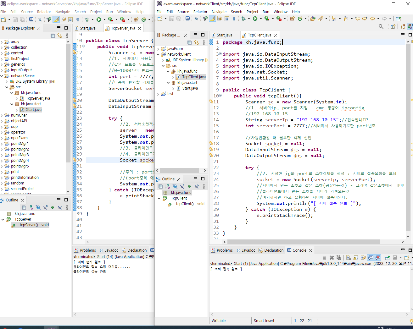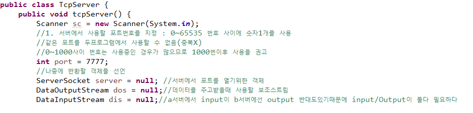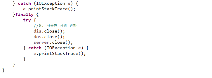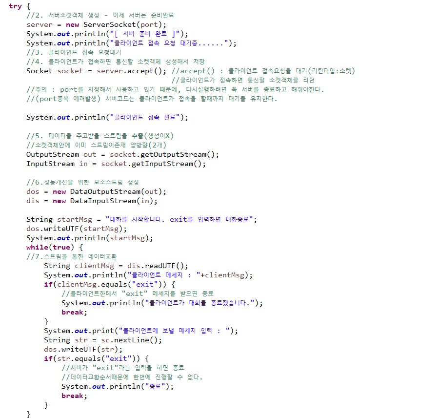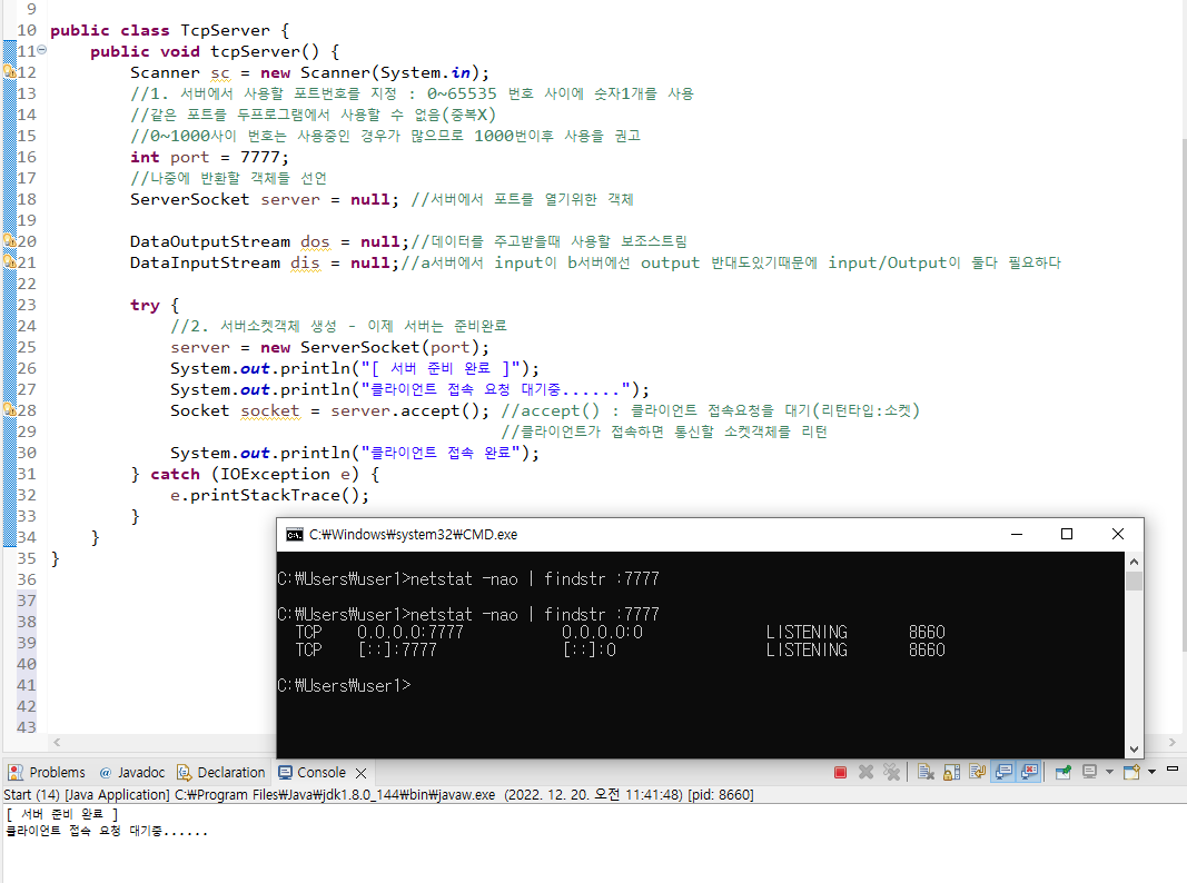 (port중복 에러발생) 서버코드는 클라이언트가 접속을 할때까지 대기를 유지한다.