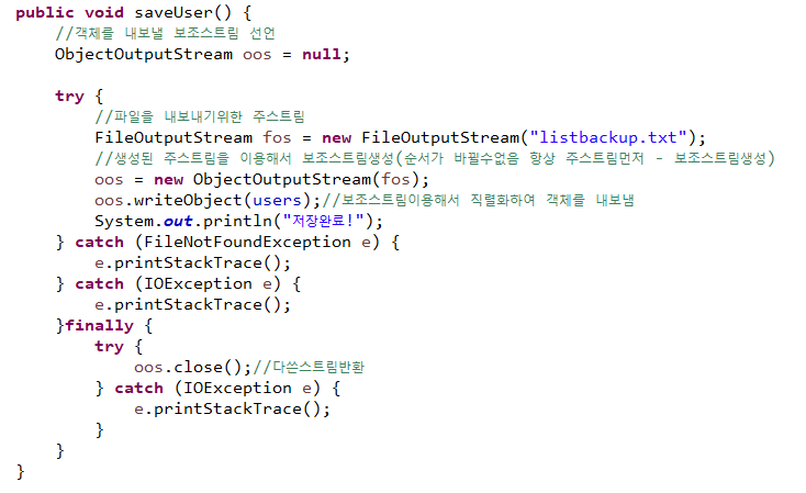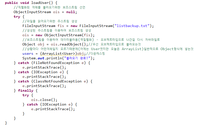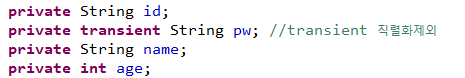 +추가 ) 만약 파일로저장/불러오기 시 공개하고싶지않은 값이 있으면(비밀번호 등) 변수들을 선언한 vo클래스 User.java에서 해당변수값에 transient를 입력해주면된다.