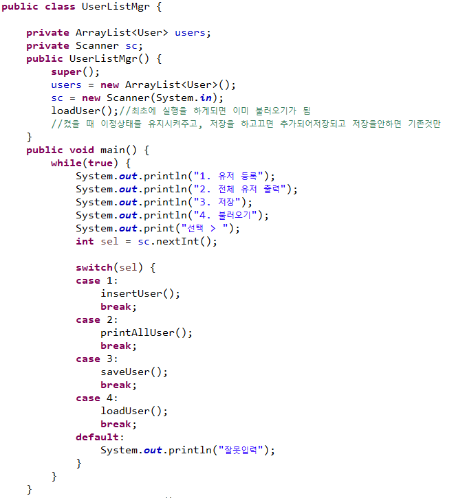 - 유저목록을 ArrayList에서 관리하고, 파일로 저장/로드하는 프로그램 (어제 한 UserMgr 다른버전)