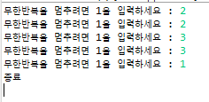 System.out.print("무한반복을 멈추려면 1을 입력하세요 : ");
