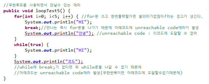 2. while(true)내부에 break가 없다면 평생 while의 반복을 나오지 못하므로 그 이후의 코드에 도달 할 수 없다.