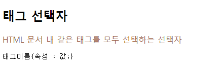 <p>HTML 문서 내 같은 태그를 모두 선택하는 선택자</p>