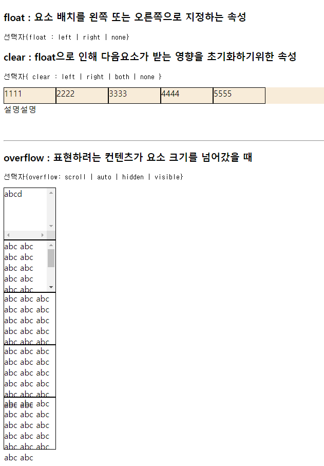 <pre>선택자{overflow: scroll | auto | hidden | visible}</pre>