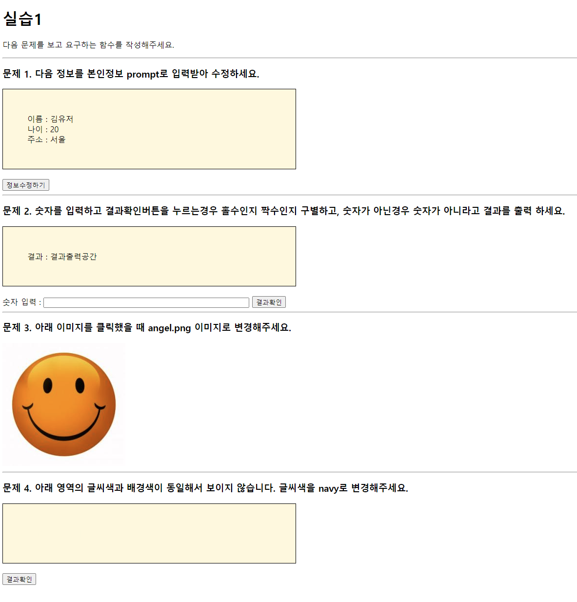 <h3>문제 1. 다음 정보를 본인정보 prompt로 입력받아 수정하세요.</h3>