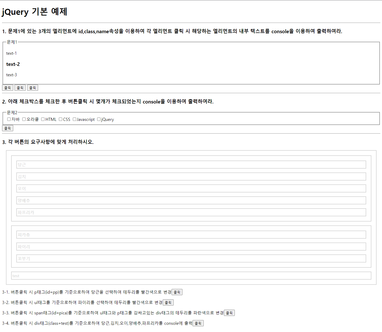<p>3-4. 버튼클릭 시 div태그(class=test)를 기준으로하여 당근,김치,오이,양배추,파프리카를 console에 출력<button onclick="exam4();">클릭</button></p>