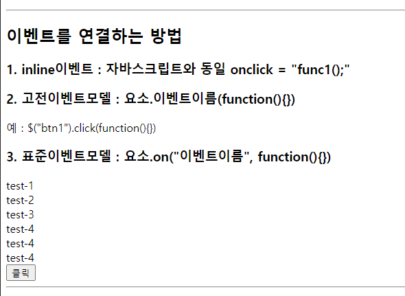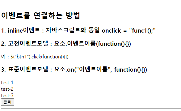 <h3>1. inline이벤트 : 자바스크립트와 동일 onclick = "func1();"</h3>