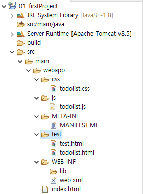 - todolist는 이전 javascipt수업때 실습한파일을 그대로 가져옴 (js와 css폴더도 가져와서 webapp아래에 넣어준다)