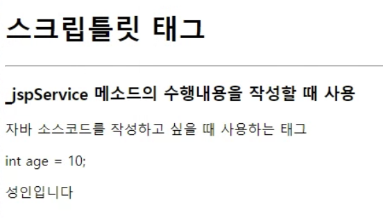 <%if(age > 19){%> <!-- html을 사용하다가 중간에 자바코드를 사용하고 싶을 때 사용 -->