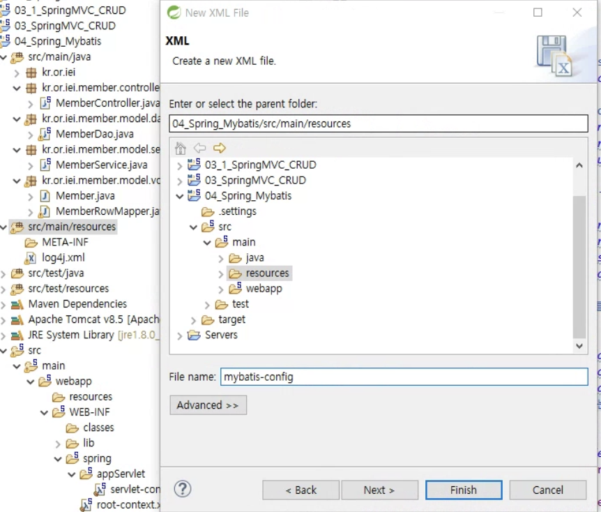 4. src/main/resources에 mybatis-config와 mapper패키지추가(mapper패키지에 앞으로 작성할 SQL문이 들어갈것)