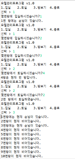 퇴실 : 입력받은 방 퇴실(퇴실 시 빈방은 빈방이라는 메세지)